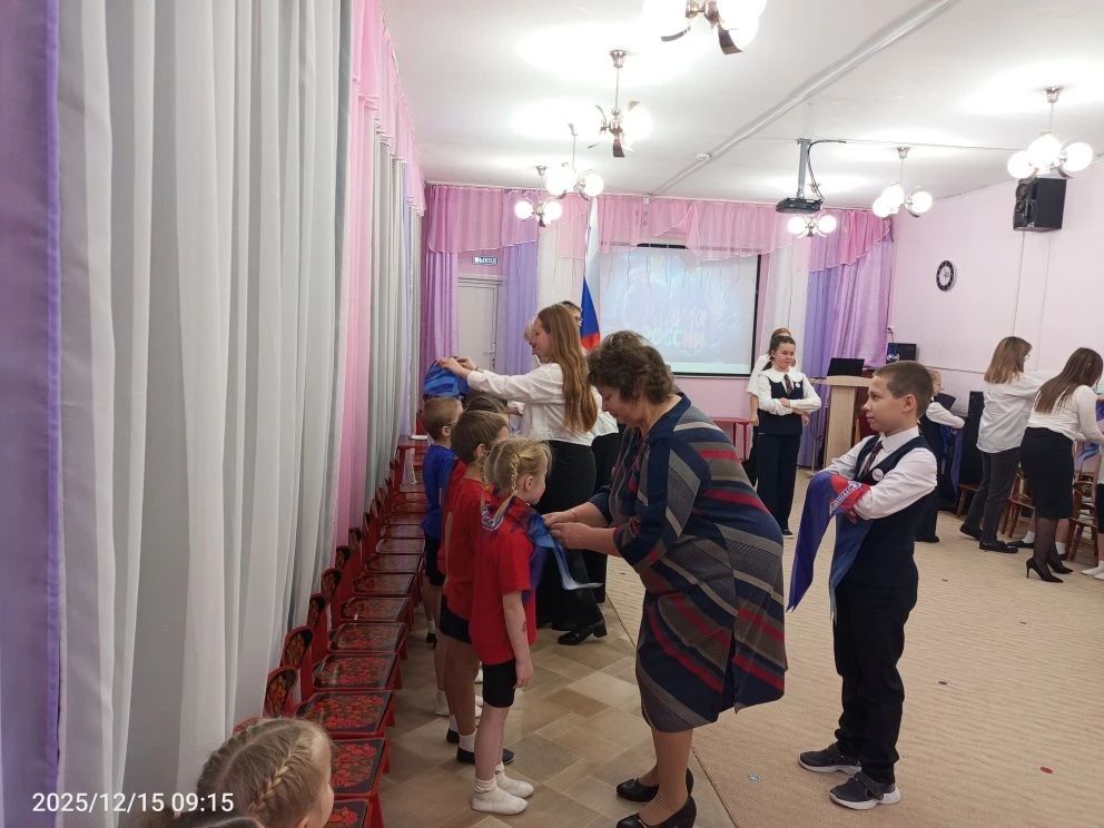 Право повязать галстуки орлят-дошколят было предоставлено наставникам орлят: педагогам детского сада и активу родителей. А орлята-школьники помогали.